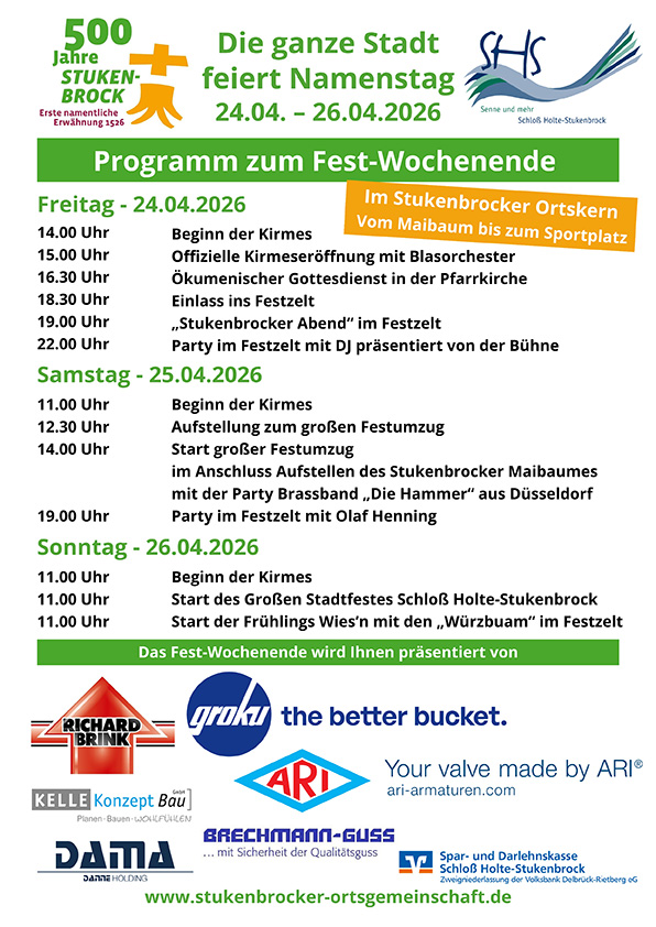 - Anmeldung zum FestumzugAb sofort können Sie sich zum Festumzug am Samstag, den 25.04.2026 anmelden. Hier kann das PDF mit dem Anmeldeformular zum Fest-Umzug heruntergeladen werden. Einfach ausdrucken, ausfüllen und an die Stukenbrocker Ortsgemeinschaft e.V.c/o Daniel … Weiterlesen …